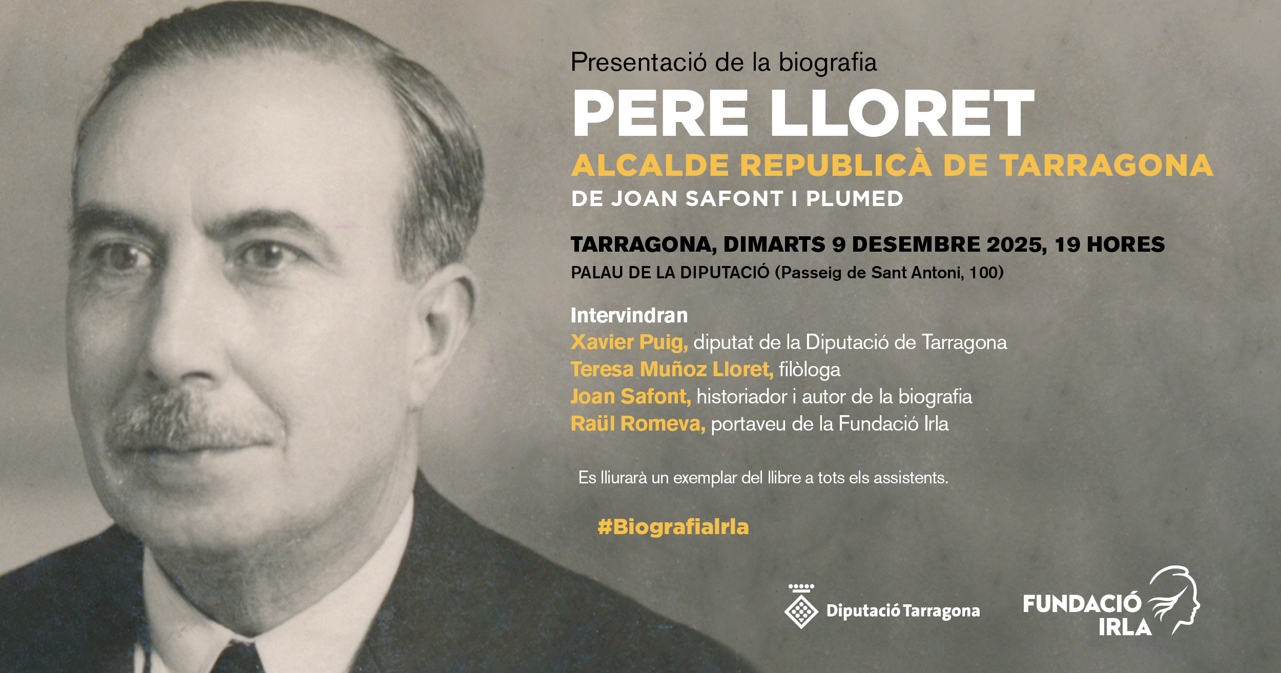 L’acte tindrà lloc dimarts 9 de desembre, a les 19 h, al Palau de la Diputació de Tarragona (PAsseig de Sant Antoni, 100). No cal inscripció prèvia i totes les persones assistents rebran un exemplar de la biografia gratuït. També es podrà seguir en format online a través del canal de Youtube de la Fundació o per xarxes socials amb l’etiqueta #BiografiaIrla.