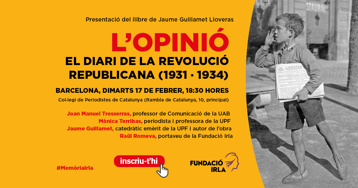 La presentació es farà el proper dimarts 17 de febrer, a les 18:30h, al Col·legi de Periodistes de Catalunya (Rambla de Catalunya, 10, principal). També es podrà seguir en format online a través del canal de Youtube de la Fundació o per xarxes socials amb l’etiqueta #MemòriaIrla.
